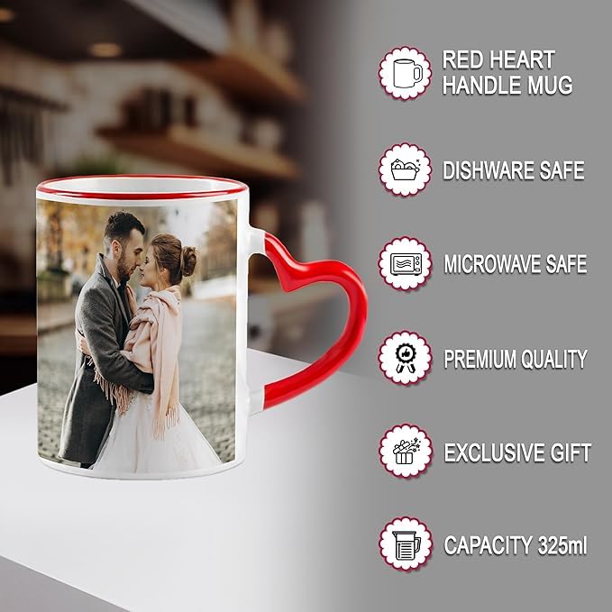 SAI UNIQUE GIFTS Customised Ceramic 350 ml Red Heart Shape Handle Coffee Mug, with Photo for Birthday, Anniversary, Valentine’s Day Gift, Free Keychain